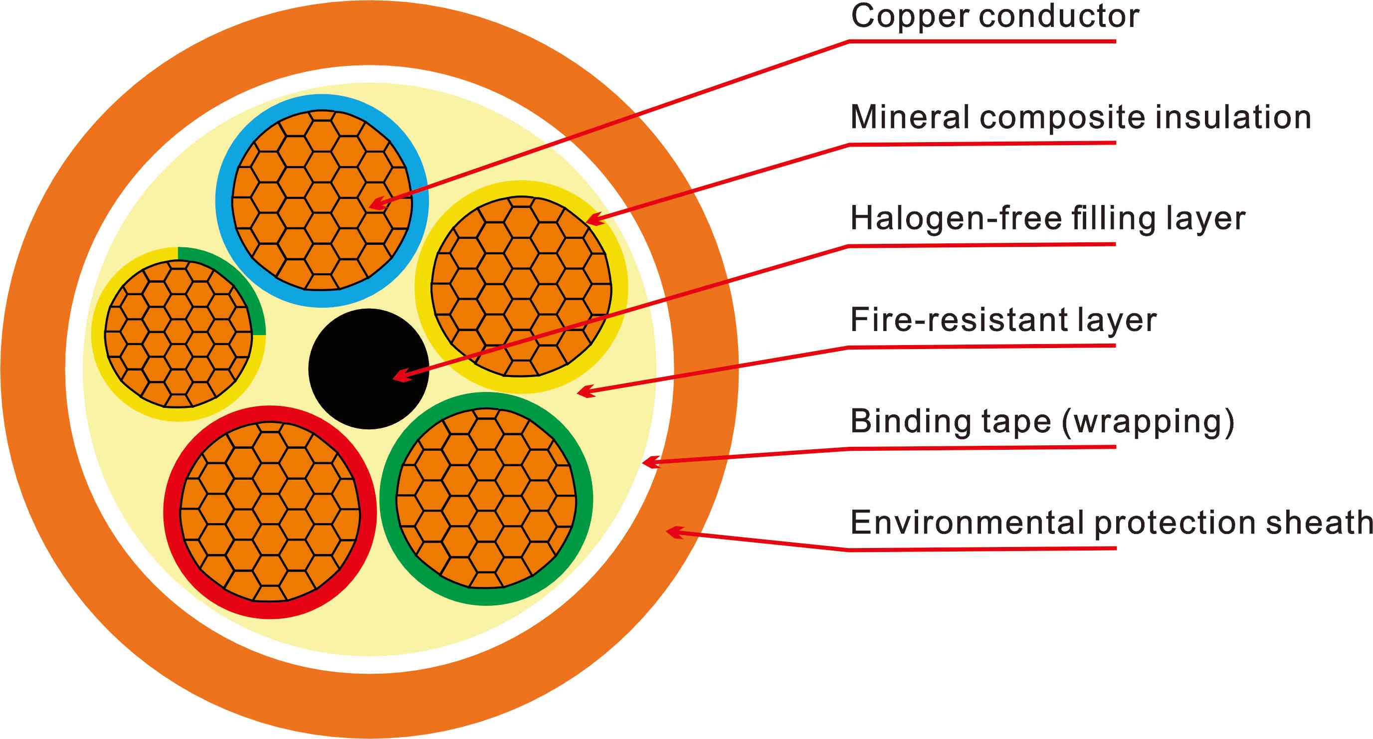 Aislamiento libre de halógenos, de baja emisión de humo y resistente al envejecimiento; excelente resistencia a la corrosión y a la radiación.