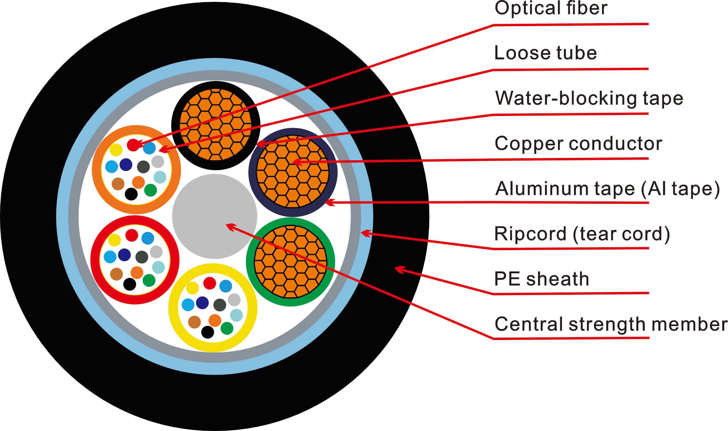 Vaina exterior: PVC, PE o LSZH; cubiertas anti-rastreo para escenarios aéreos/similares a ADSS opcionales